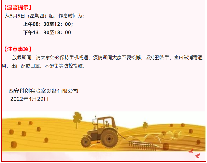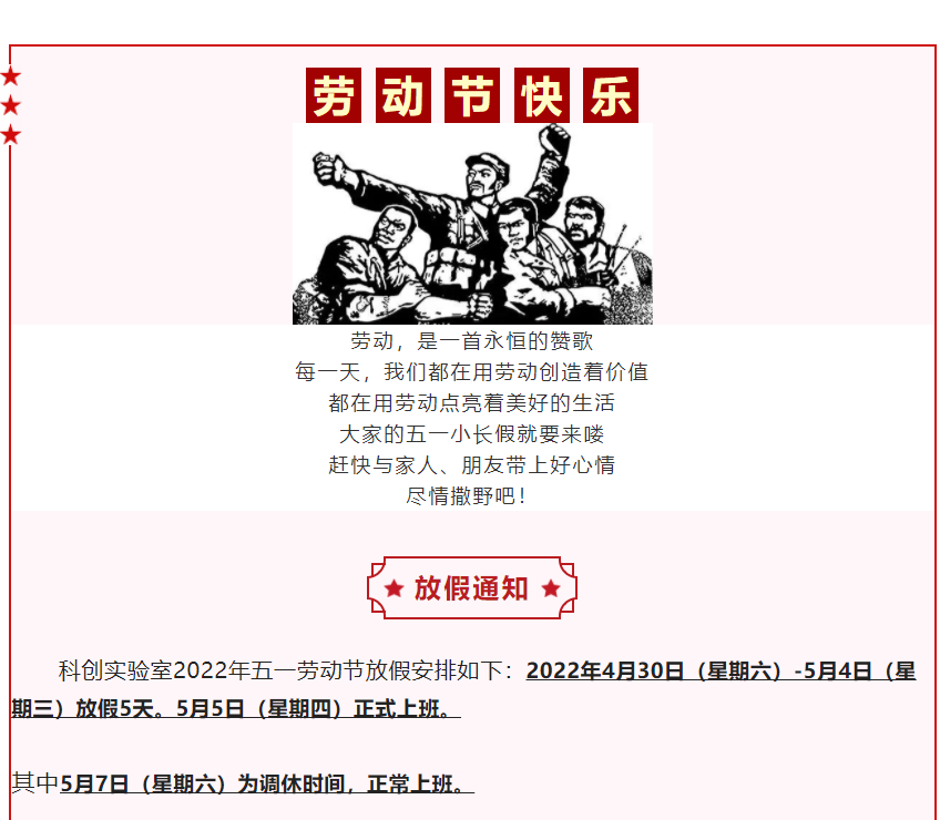 科創(chuàng)實(shí)驗(yàn)室2022年五一放假調(diào)休通知 發(fā)布時(shí)間:2022-04-29 14:25:59 分享到: 上一篇:PCR實(shí)驗(yàn)室建設(shè)要點(diǎn)與院感管理 下一篇:恭喜科創(chuàng)各實(shí)驗(yàn)室項(xiàng)目順利完工