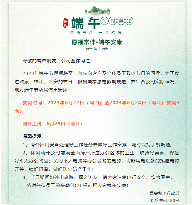 西安科創(chuàng)端午節(jié)放假通知 發(fā)布時間:2023-06-20 14:30:37 分享到: 上一篇:西安科創(chuàng)端午節(jié)放假通知 下一篇:實驗室家具臺面如何選擇?