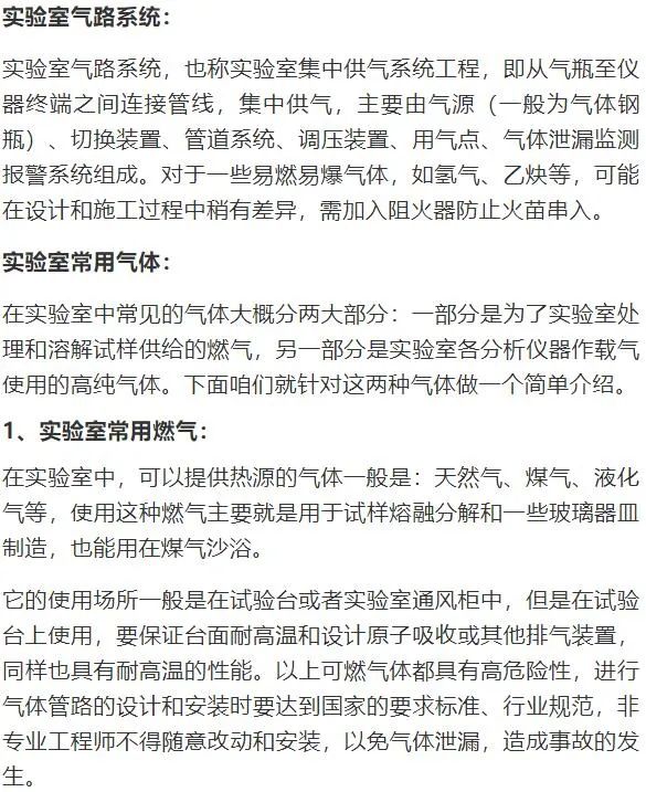 在各大科研實(shí)驗(yàn)室中,不管是為了實(shí)驗(yàn)溶解試樣的燃?xì)膺是分析儀器所需要的高純載氣,都需要通過實(shí)驗(yàn)室氣路系統(tǒng)進(jìn)行集中供氣,這樣不僅是使用方便,還有保護(hù)氣體純度、提高用氣安全等特點(diǎn)。 以上,就是關(guān)于實(shí)驗(yàn)室氣路系統(tǒng)及實(shí)驗(yàn)室常用氣體的簡單介紹,實(shí)驗(yàn)室氣路系統(tǒng)的主要應(yīng)用于高純度氣體,是易燃易爆、有毒、腐蝕性等高純氣體的控制設(shè)備,是實(shí)驗(yàn)室氣體使用安全保障。 上一篇:醫(yī)學(xué)實(shí)驗(yàn)室裝修之排水系統(tǒng) 下一篇:實(shí)驗(yàn)室裝修設(shè)計(jì)的細(xì)節(jié)