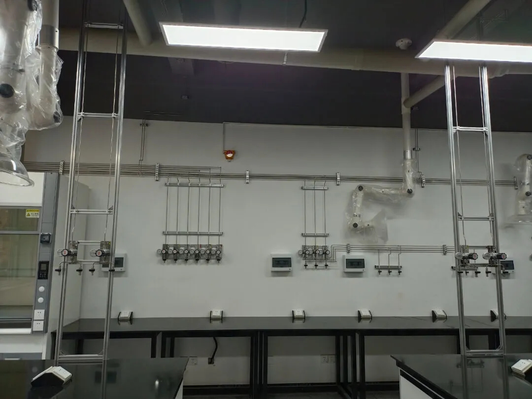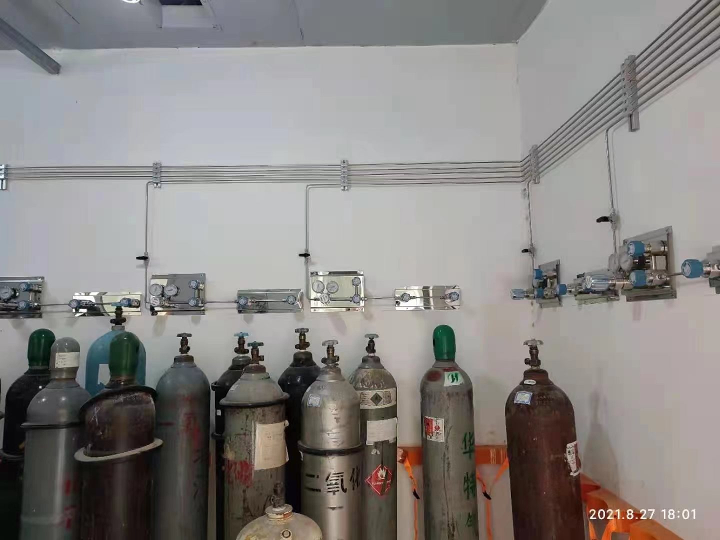 本供氣系統(tǒng)中,共有4種分析儀器需要用到高純氣體,分別為氣相色譜(N2、H2和壓縮空氣)、氣質(zhì)聯(lián)用(氦氣)、火焰光度計(jì)(壓縮空氣和乙炔)、熒光定硫儀(氬氣和高純氧)的使用點(diǎn)。根據(jù)分析儀器對(duì)氣體流量及氣體潔凈度的要求,管道采用1/2”外徑,內(nèi)表面BA級(jí)的不銹鋼管道。所有管路在氣瓶間集中后,沿實(shí)驗(yàn)樓外墻(加蓋活動(dòng)蓋板以便于維修和檢測(cè))至二樓,穿外墻貼進(jìn)入實(shí)驗(yàn)室(1/4”管徑),在分析儀器的附近預(yù)留出口點(diǎn)。綜上,本項(xiàng)目中共用到7種氣體,14組(共46個(gè))出口點(diǎn),實(shí)驗(yàn)室(兩氣氣相色譜間)內(nèi)氫氣管線上4個(gè)氫氣發(fā)生器進(jìn)口點(diǎn)。
