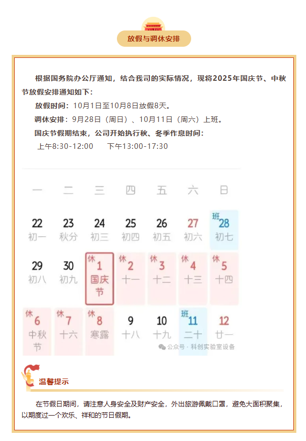 科創(chuàng)實驗室2025年國慶節(jié)、中秋節(jié)放假安排的通知 發(fā)布時間:2025-09-26 13:43:23 分享到: 上一篇:等級潔凈實驗室裝修規(guī)劃與實施要點:絕非“刷刷墻、換換氣”那么簡單 下一篇:實驗室裝修及家具案例
